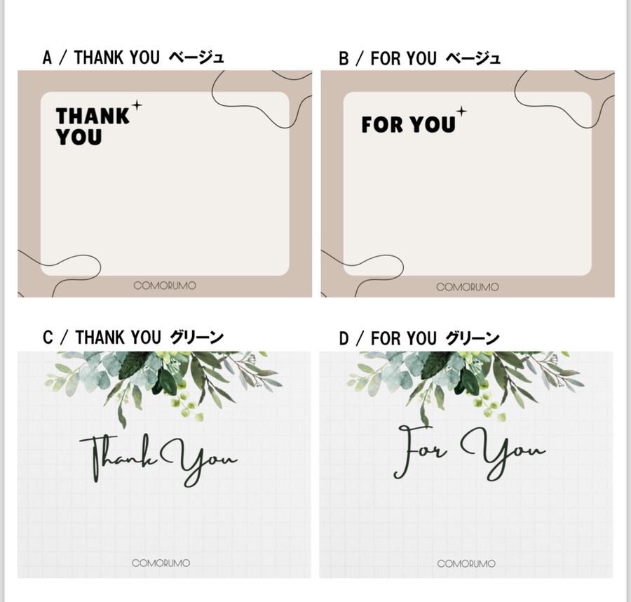 以下の4つからメッセージカードをお選びいただけます。手数料として「50円」のご負担をいただきます。サイズ縦7.5cm×横10cm(画像参照)追加のメッセージが30文字以内でいれられます。注文時の備考欄にご記入ください。